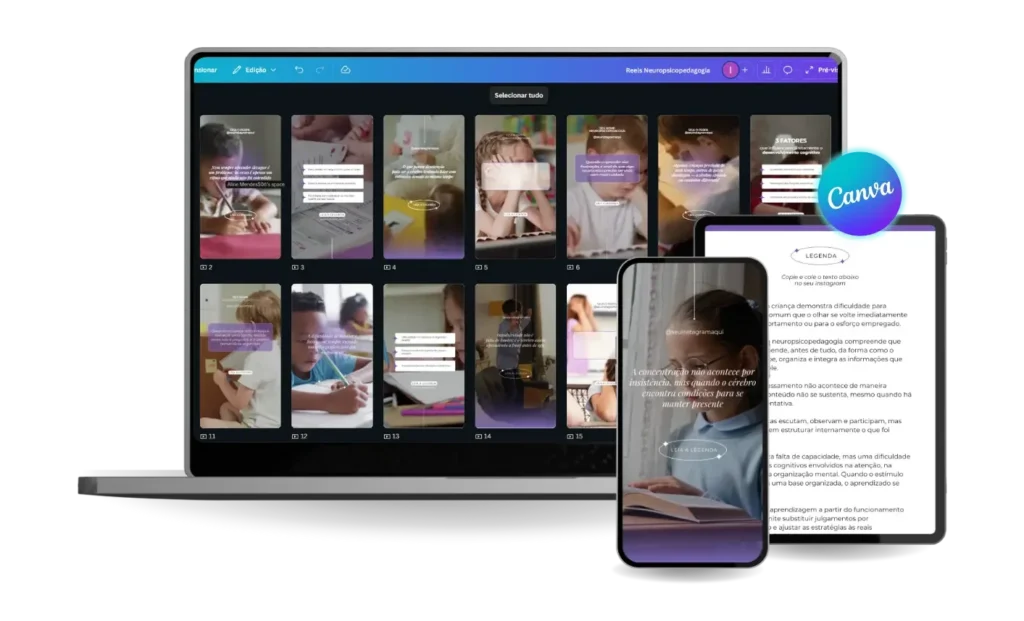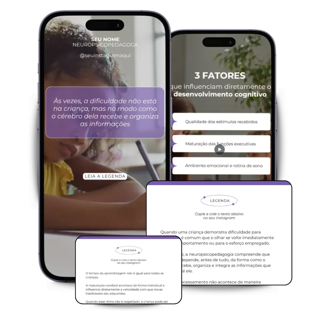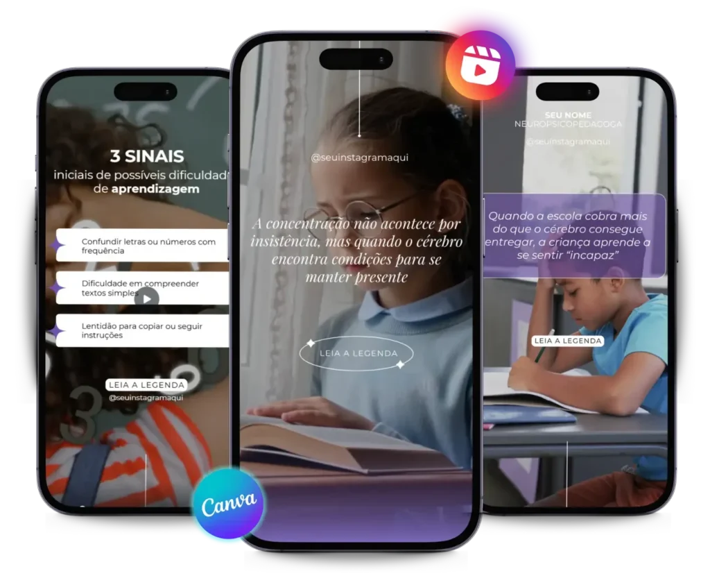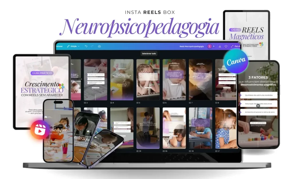 Todo conteúdo foi pensado especialmente para neuropsicopedagogas que querem crescer no instagram e atrair mais seguidores e pacientes sem precisar gravar vídeos do zero.