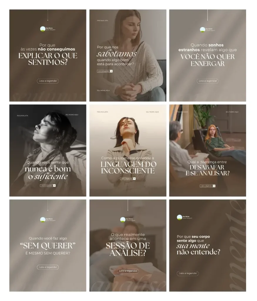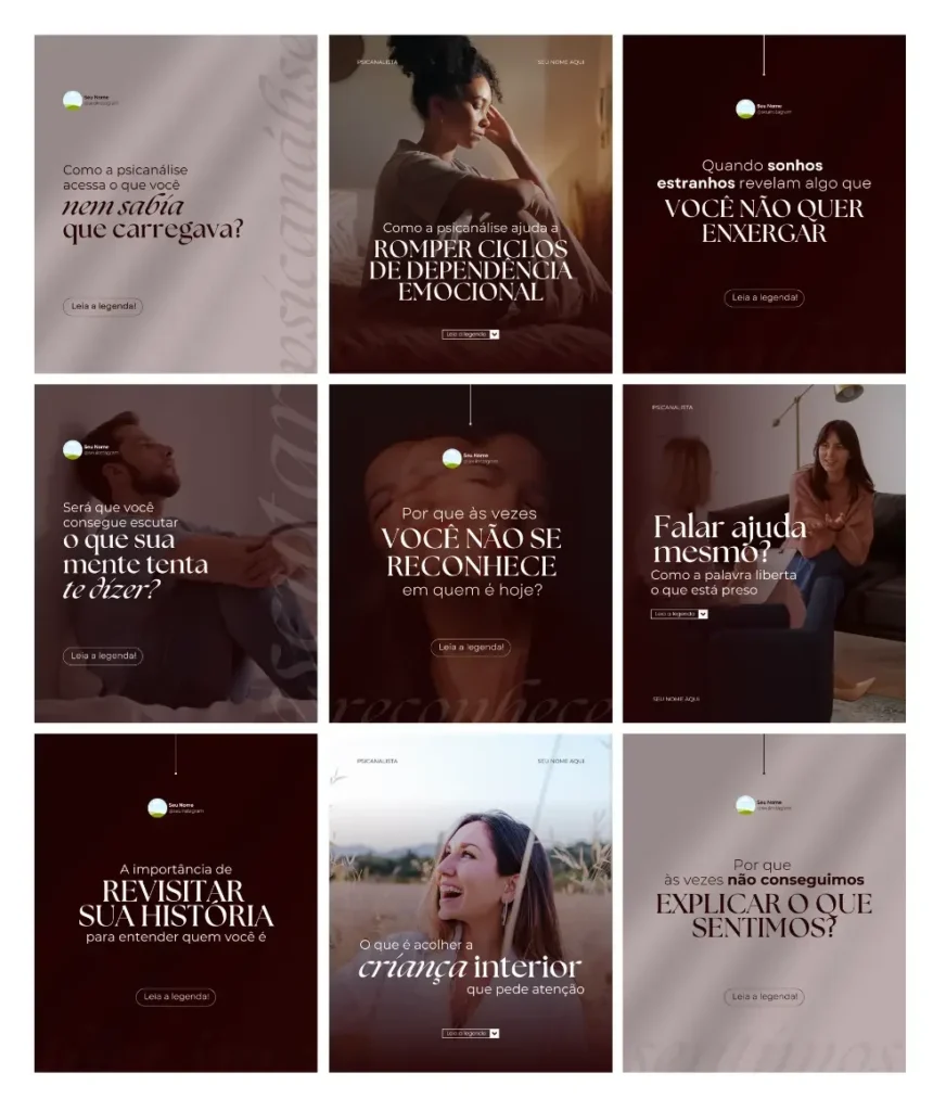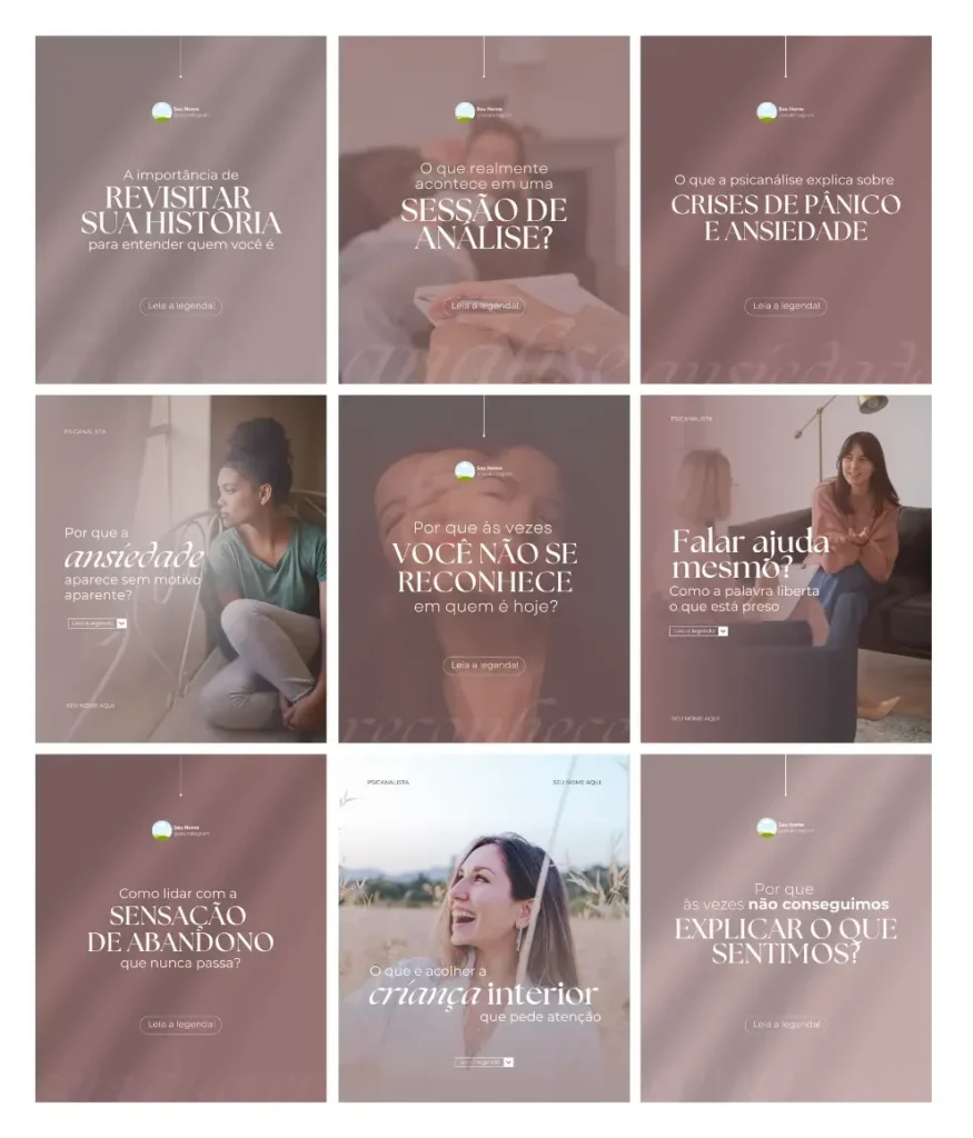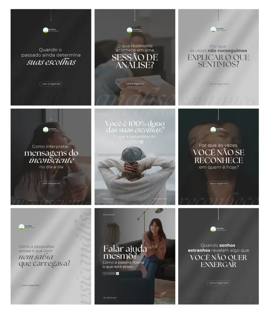 Todo conteúdo é 100% editável no Canva gratuito e foi desenvolvido especialmente para você, psicanalista, que deseja ter um perfil que atrai pacientes todos os dias.