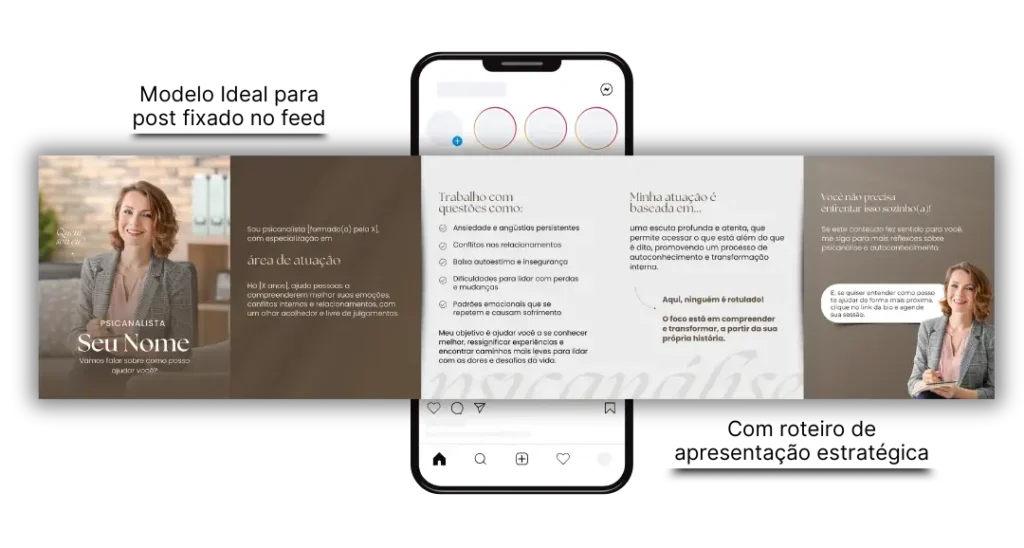 Apresente-se de forma estratégica e conquiste a confiança do seu público! São 4 modelos disponíveis no formato carrossel com roteiro envolvente, perfeito para fixar no topo do seu feed.